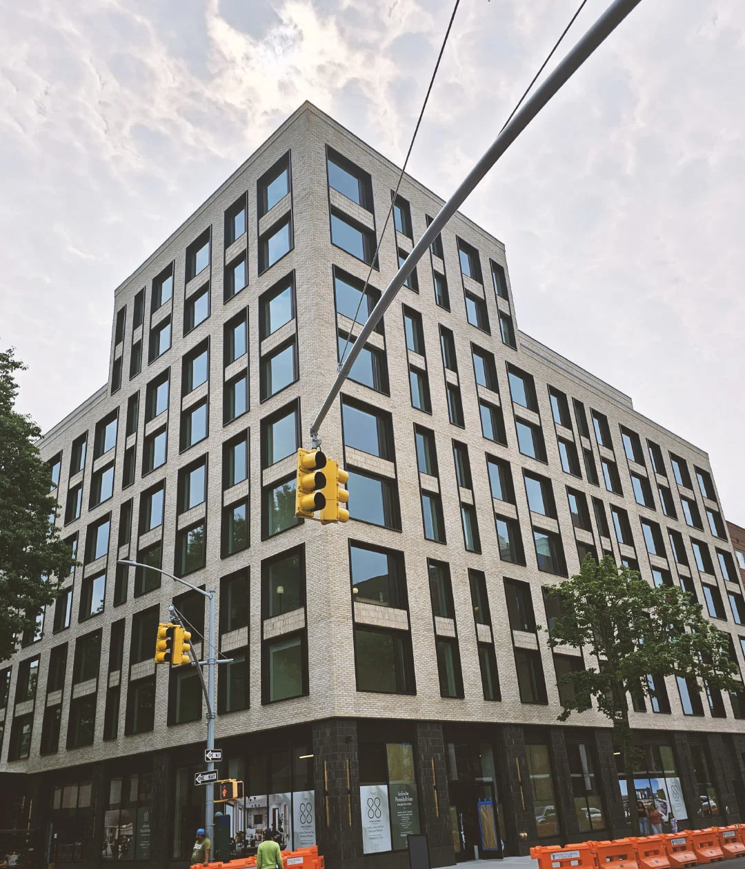 Alternating volumes of brick and floor-to-ceiling glass on the ground floor will likely shroud the community facility space. Solar panels on the roof will produce green energy.