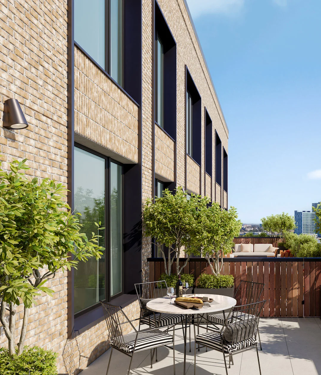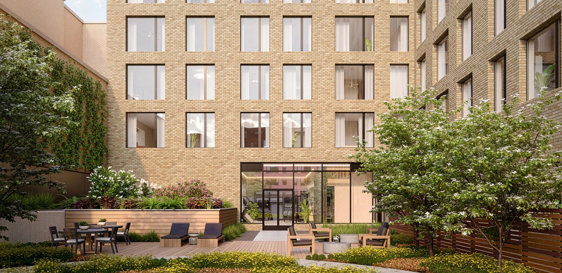 Renderings depict a pale brick facade with an even grid of large square windows. Setbacks on the upper floors reveal landscaped terraces for both private and communal use.