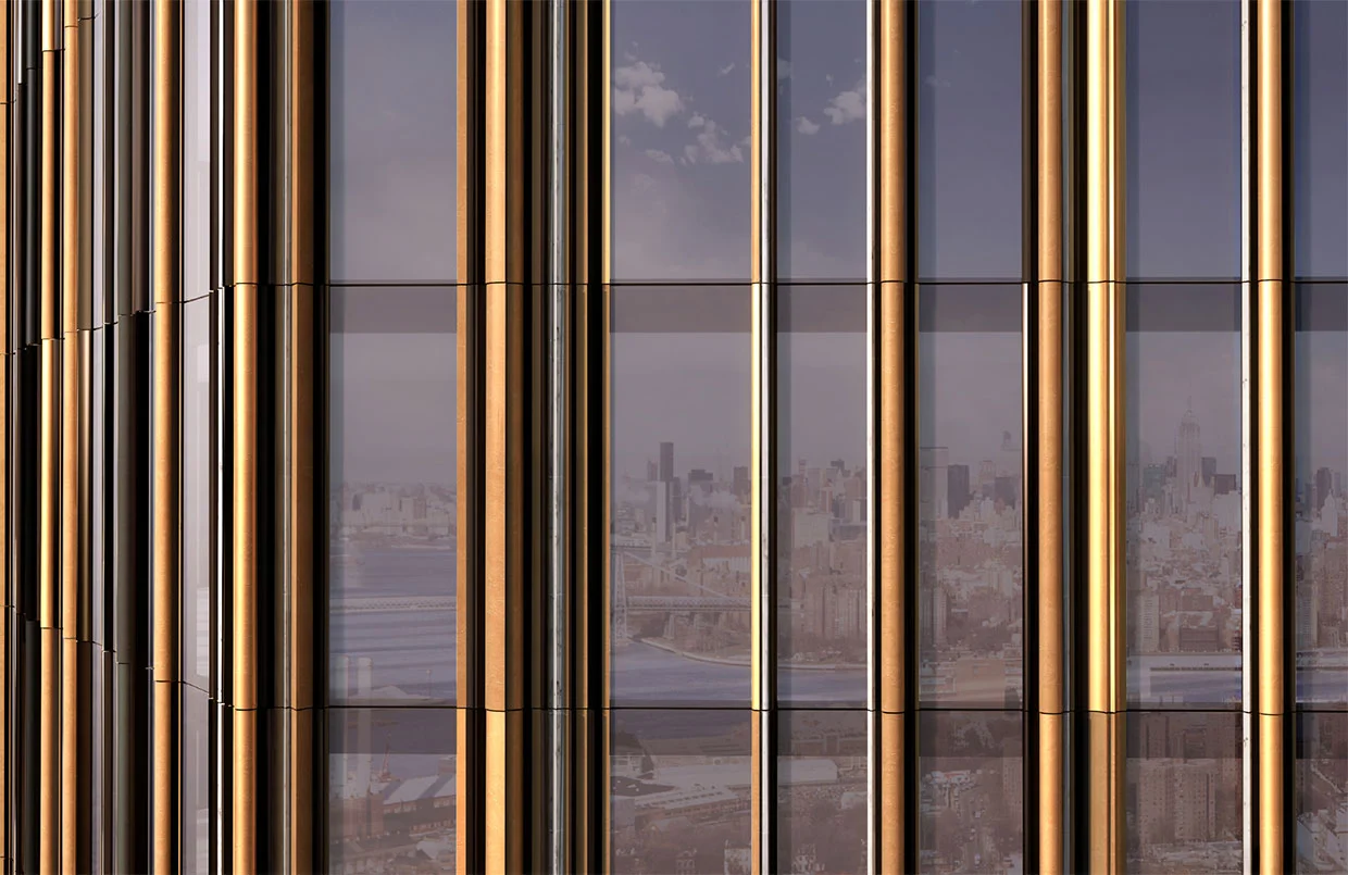 With its interlocking hexagonal design and rich materiality of bronze and glass, the tower repeats features and patterns of the historic site into a cinematic expression of the rich past and future of Brooklyn.