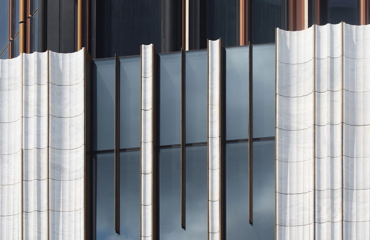 The facade of 9 DeKalb Avenue is a blend of historic and modern elements, featuring the preserved white marble and granite base of the 1908 Dime Savings Bank, with a spiraling, dark-tinted glass and bronze, copper, and steel supertall tower rising behind it.
